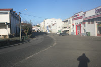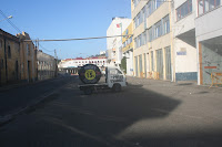 Foi dia de ver a rua da SOERAD, quase limpa de carros, desafogada. O anúncio aos pneus usados tem graça e domina a paisagem. Num dos começos da Rua Cândido dos Reis, perto da ponte sobre o Sisandro,