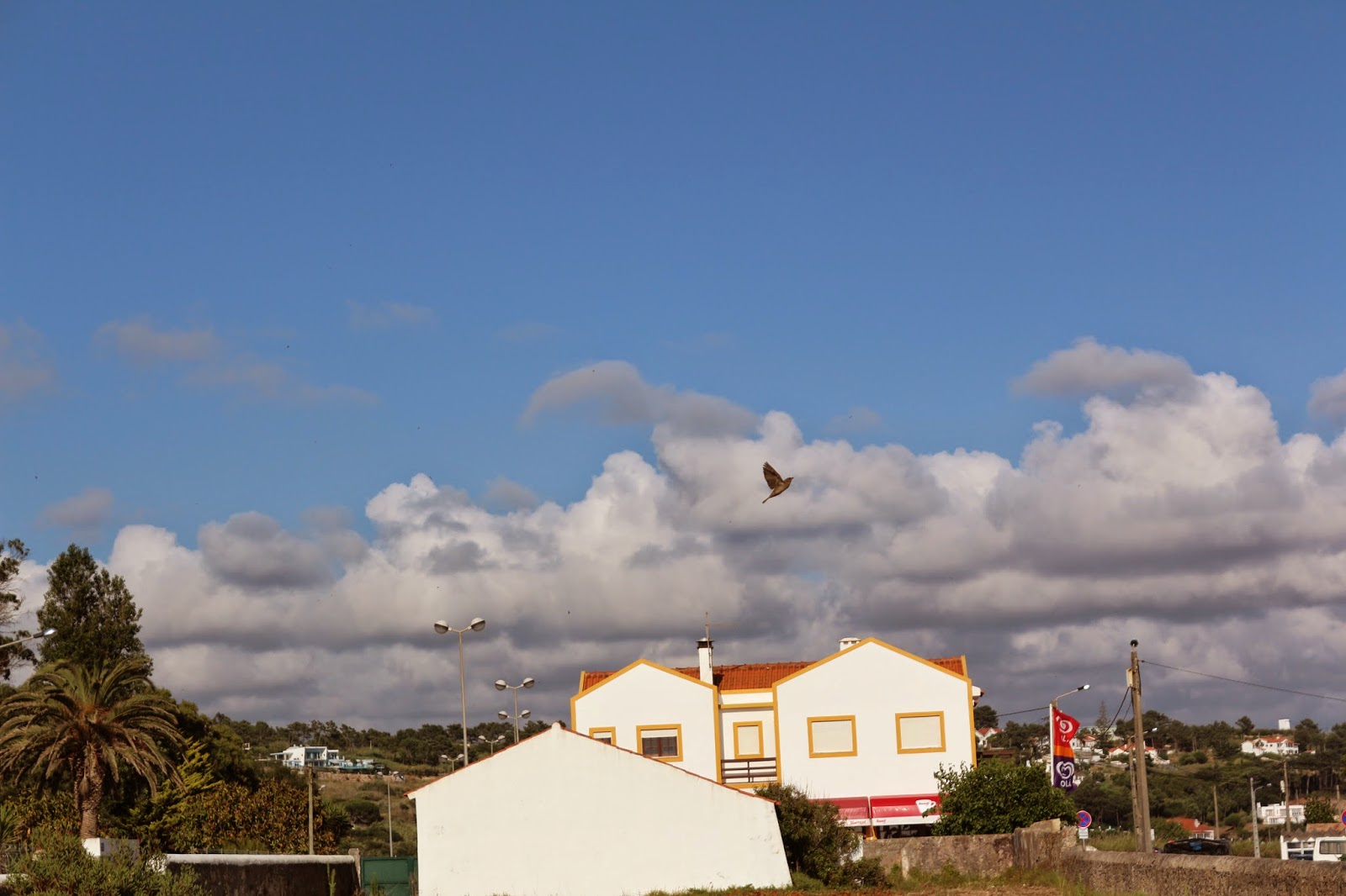 Nos fios, a que poderíamos chamar o seu chão subtil, de tão fino que é, vão poisando e levantando voo pássaros e rolas. Estão sobre um logradouro, em frente do INATEL; a admirar os espaços verdes daquela instituição, o conjunto habitacional e a capela e edifício anexo.