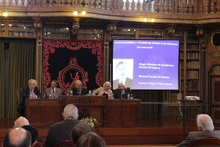 Na mesa: Manuel Lemos de Sousa, Carlos Salema (vice-presidente da Academia e presidente da Classe de Ciências), Artur Anselmo, (presidente da Academia e presidente da Classe de Letras), Maria Salomé Pais, (secretária-geral da academia), Soares Martínez, (decano da Classe de Letras)