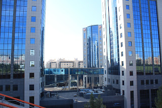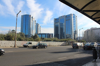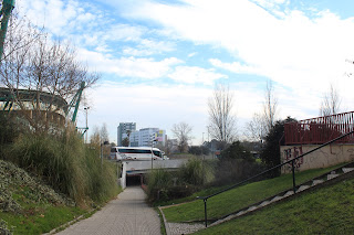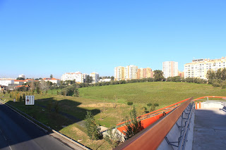 Vista a partir da ponte pedonal, com uma das Torres de Lisboa em fundo. Vamos atravessá-la.