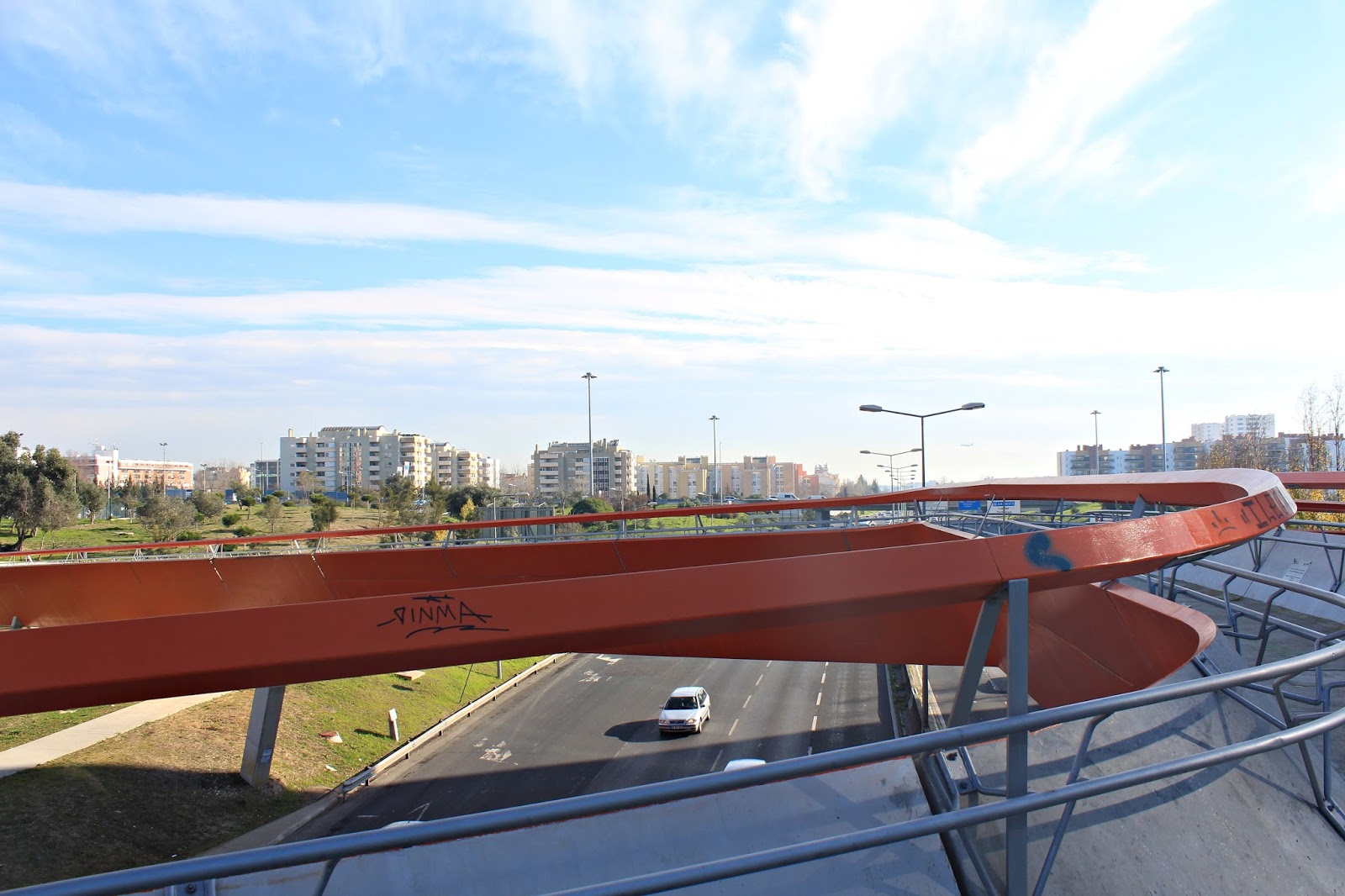 Vê-se na sua cor alaranjada, a ponte pedonal e ciclável que liga os dois lados da Segunda Circular, obra realizada a partir de projecto lançado pela Fundação Galp Energia.