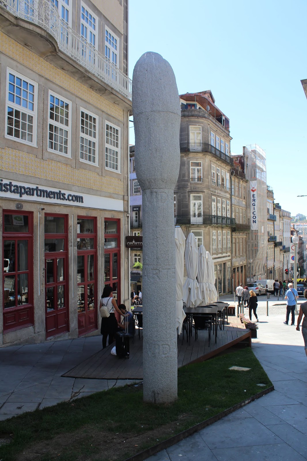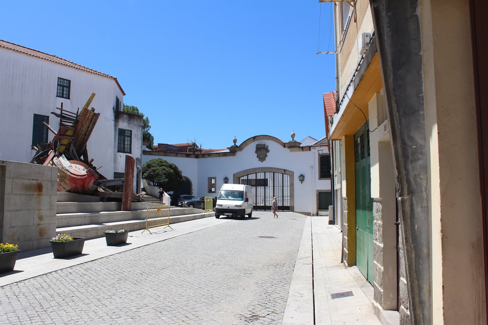 Na bela fachada, ao fundo, – adoro o granito –, há qualquer coisa de surreal na estátua de João Cutileiro. Vista a distância, parece a