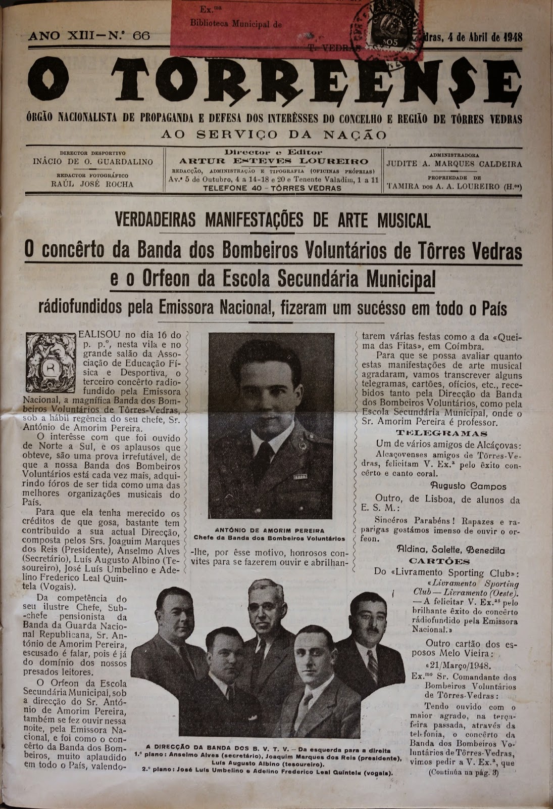 vedras, aos Directores da Banda dos Bombeiros Voluntários; pela Comissão do