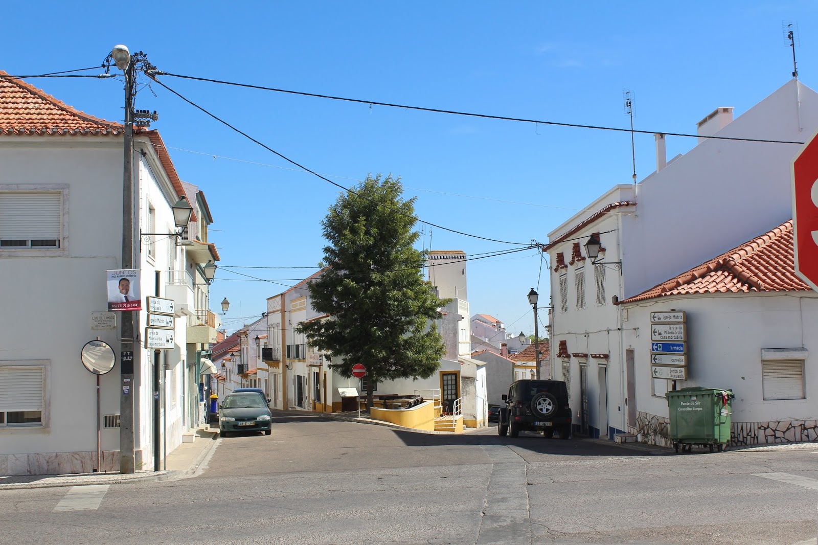 Fotografia tirada junto ao café Pão da Vila, Largo de S. Sebastião, 21. Em frente, à esquerda, Rua do Comércio. À direita, Rua da Misericórdia. Mais: numa das pontas da vila, uma impressão na técnica de stencil em casa humilde resiste à passagem do tempo...
