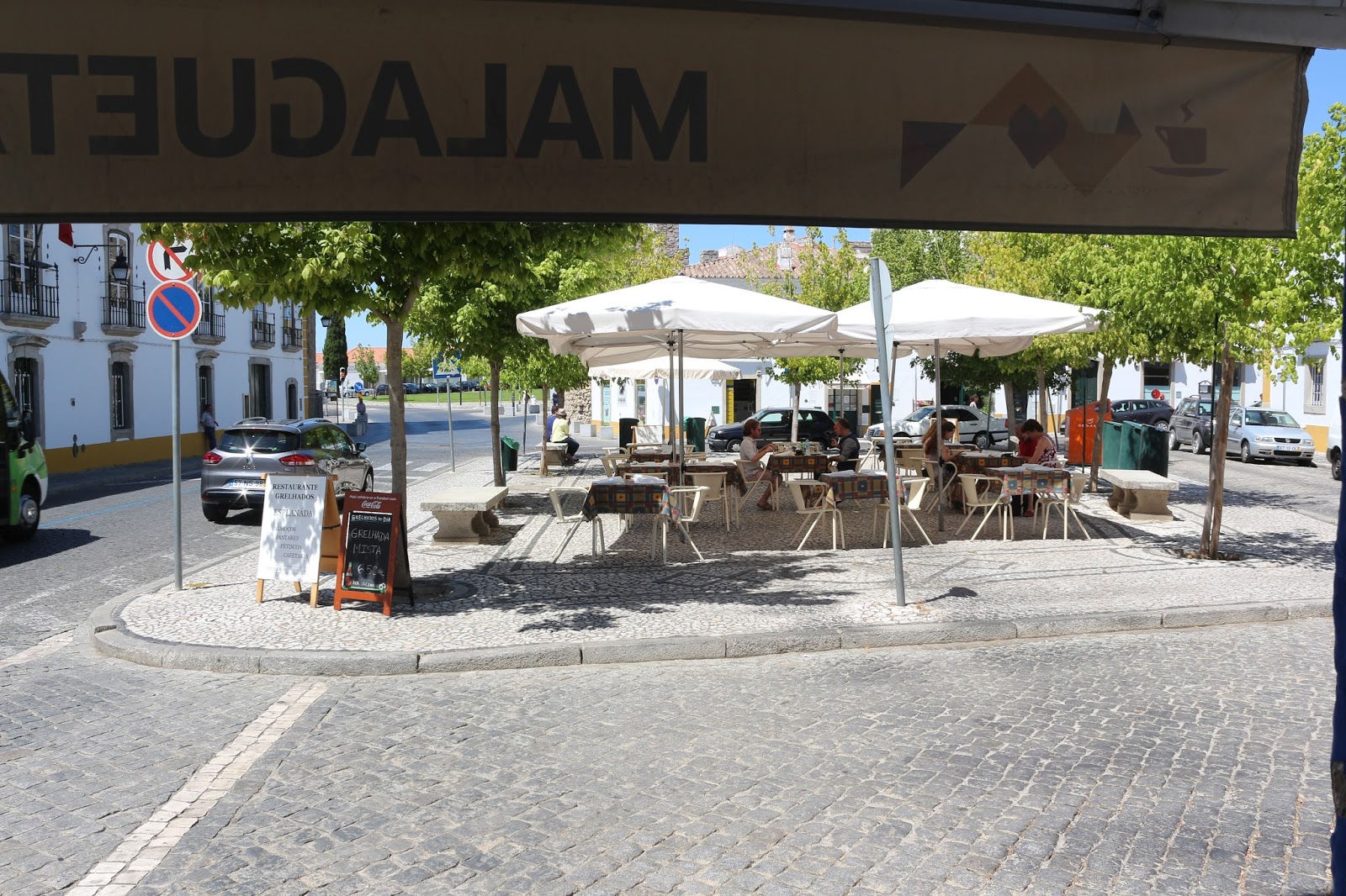 No edifício da esquerda, junto à barra amarela da esquina, está uma placa toponímica; e outra idêntica na fachada do prédio do bar-restaurante MALAGUETA