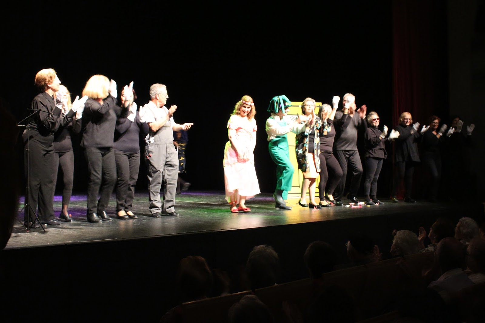 Na despedida, juntaram-se os elencos das duas peças. De preto, as moscas; antes da Princesa Princesinha, de cor-de-rosa, o Xico Parafuso. entre um e outro, lá no fundo escuro, esconde-se a bruxa que queria ser astronauta; a seguir, O Grande Espinafre e outros.