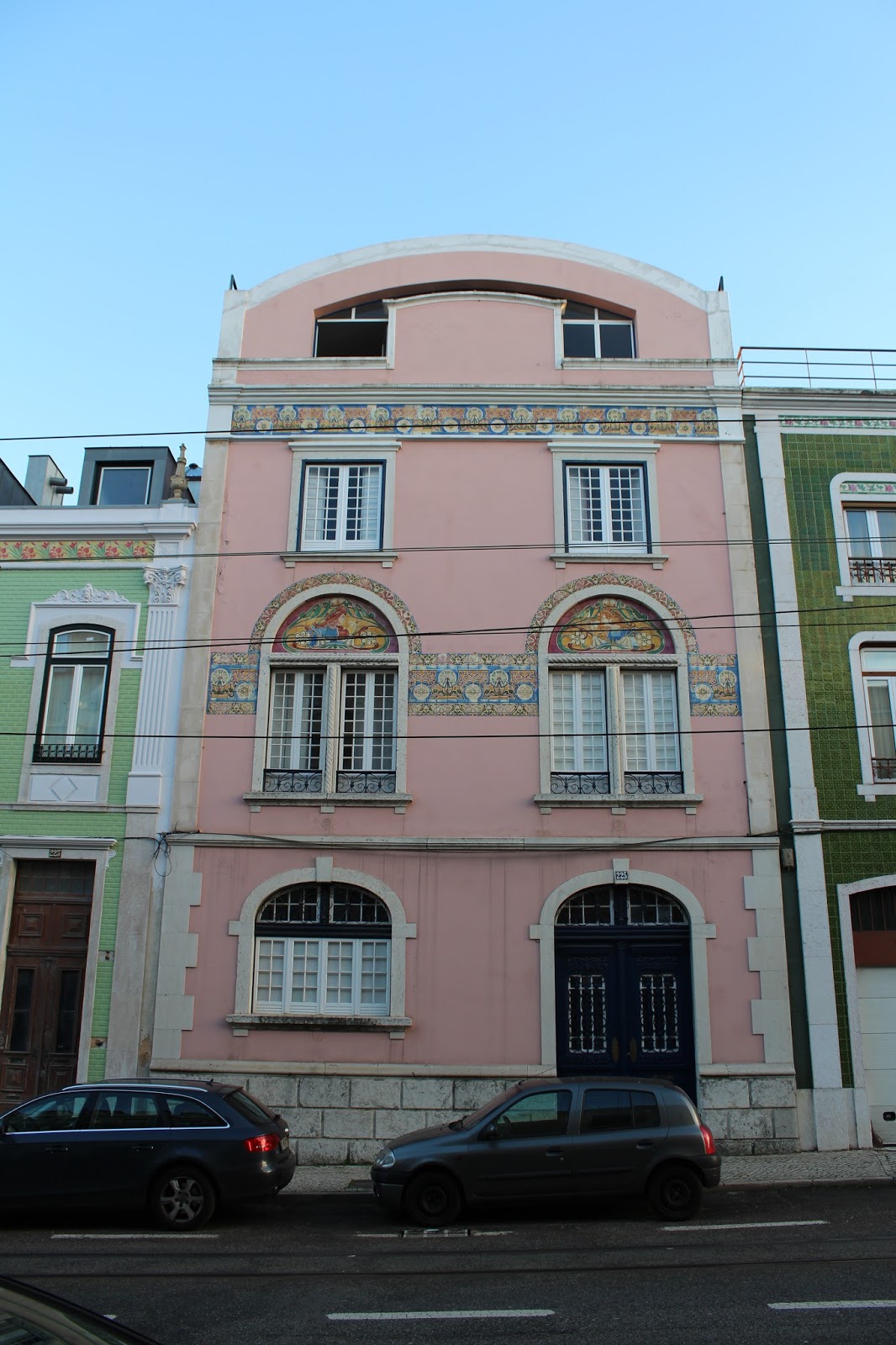Continuando a caminhada na Rua da Junqueira, encontramos um edifício de qualidade arquitectónica e decorativa relevante, decorado com azulejos cheios de bom gosto e colorido. Os que ocupam o tímpano das duas janelas centrais são vitrais em azulejo.